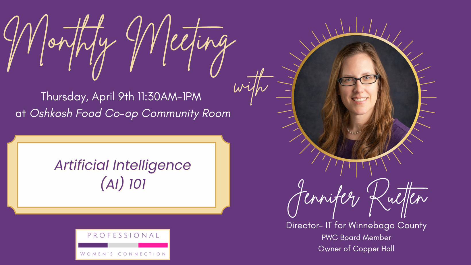 Join the Professional Women’s Connection (PWC) as we welcome our very own Jennifer Ruetten, Director of Information Technology for Winnebago County, for an engaging and real conversation on AI.